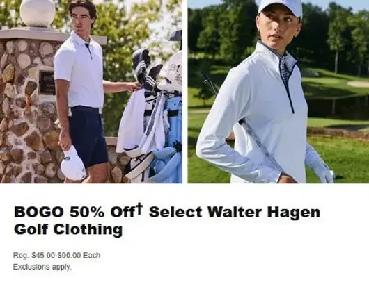 Get it now! Shop in store and enjoy BOGO 50% off select Walter Hagen golf clothing.